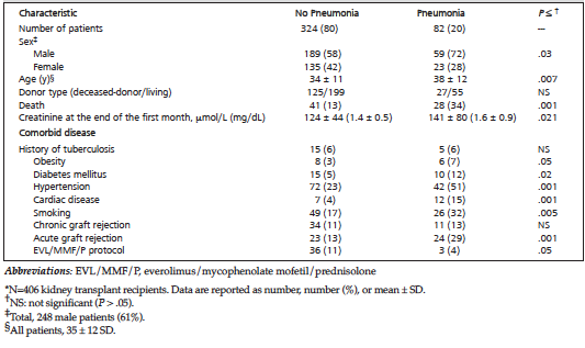 In multivariate analysis, significant risk factors associated with pneumonia episodes were: older age (OR=1.02; 95% CI: 1-1.05; P ≤ .03), hypertension (OR=3.0; 95% CI: 1.5-6.2; P ≤ .003), cardiac disease (OR=11.5; 95% CI: 2.4-56.1; P ≤ .002), history of acute graft rejection (OR=11.3; 95% CI: 3.7-35; P ≤ .001), and not using everolimus/mycophenolate mofetil/prednisolone protocol (OR=10.7; 95% CI: 2.9-39.1; P ≤ .001).