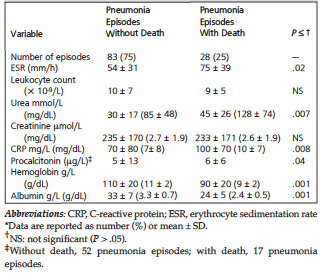 Most pneumonia episodes were not associated with death (Table 2). Factors that