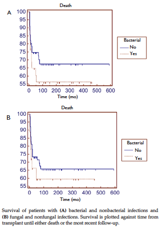 In 82 kidney transplant recipients who developed pneumonia, Kaplan-Meier plots showed that there was no difference in survival between patients who had bacterial (26 patients) or nonbacterial (56 patients) infection (hazard ratio = 0.63; 95% CI: 0.28-1.44; NS) or between patients who had fungal (18 patients) or nonfungal (64 patients) infections (hazard ratio = 0.68; 95% CI: 0.26-1.78; NS) (Figure 1).