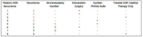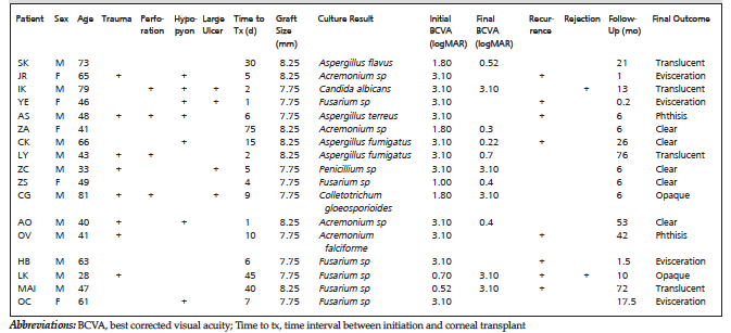 Materials and Methods: Retrospective data analyses of the medical records was performed on 17 patients who underwent a therapeutic corneal transplant for severe culture-proven fungal keratitis between October 2006 and August 2013. We evaluated demographics, fungal organism type, surgical data, recurrence presentation, disease course, follow-up, and graft status.