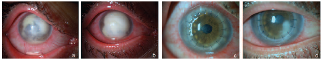Figure 2. Slit Lamp Examination Photographs of the Patient (CK) Who Had a Large Corneal Ulceration and Infiltration on the First Examination (A). The patient underwent a therapeutic corneal transplant for the disease, which was unresponsive to medical treatment (B). The graft was clear during the followup (7 mo after the surgery), (c); 1 year after surgery, (D).