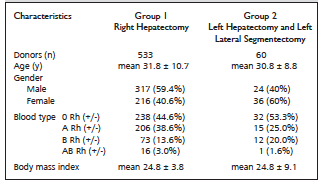 During the study period, 593 donors underwent living donor hepatectomy for living-donor liver transplant. The mean age of donors was 31.0 ± 9.9 years. The ratio of men to women was 341:252. The procedures performed included, 533 right lobe donor hepatectomies (89.9%), 45 left lateral segmentectomies (7.6%), and 15 left hepatectomies (2.5%). The mean follow-up was 342 ± 8.1 days. Because of the differences in the number of patients in donor procedure groups, to better analyze demographic, intraoperative, and postoperative follow-up results, the left lateral segmentectomies and left lobe donor hepatectomies were evaluated as a single group.
