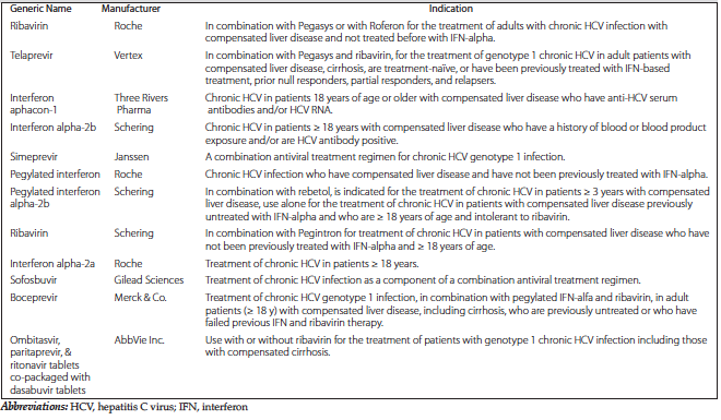 Other new antiviral agents, approved in the United States in December 2013 and in Europe in February 2014, have included nucleotide and nonnucleotide NS5B polymerase inhibitors (sofosbuvir), NS5A viral replication complex inhibitors, and second-generation protease inhibitors (simeprevir and daclatasvir), which were developed to target the second stage of the HCV life cycle. With these new agents, we have 4 treatment options (Table 2), with less pill burden and shorter duration of therapy, for treatment of chronic HCV with or without interferon.60,61 Interferon-containing regimens include the triple combination of pegylated interferon-α, ribavirin, and simeprevir or sofosbuvir. Interferon-free options include the combination of sofosbuvir and ribavirin for 12 or 24 weeks, with SVR rates of 76% for genotype 1, 93% for genotype 2, and 85% for genotype 3.62