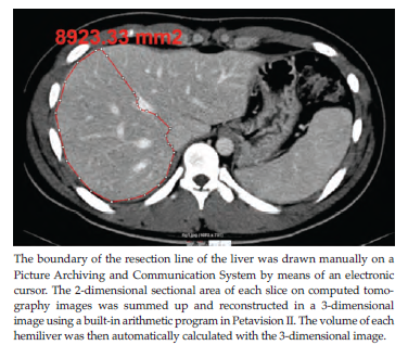Many reports have demonstrated that liver volumes measured by computed tomography (CT) volumetry are correlated with intraoperative measurements of liver weight, although the 2 are not identical.7-11 In addition, CT volume measurements have been shown to be well-correlated with the values calculated by various numerical formulas for liver weight/volume combining parameters, such as body weight, height, and body surface area.7,8,11 Thus, CT volumetry is widely used for estimating liver volume.12