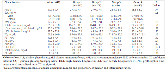 The demographic and clinical characteristics of the enrolled subjects are presented in Table 1. Hepatic steatosis ranged from 0 to 40% (median, 3%). When subjects were stratified according to degree of hepatic steatosis, 341 (53.2%) comprised group 1, 168 (26.2%) comprised group 2, 86 (13.4%) comprised group 3, and 46 (7.2%) comprised group 4.