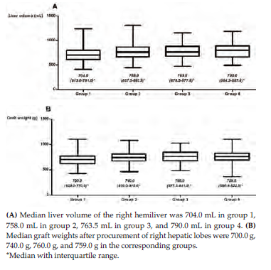The mean liver volume of the right hemiliver measured by CT volumetry was 704.0 mL (interquartile range [IQR], 613-791 mL) in group 1, 758.0 mL (IQR, 667.5-867.3 mL) in group 2, 763.5 mL (IQR, 679.5-877.8 mL) in group 3, and 790.0 mL (IQR, 664.3-887.8 mL) in group 4. The median graft weights measured after procurement of the right hepatic lobes were 700.0 g (IQR, 620.0-770.0 g), 740.0 g (IQR, 670.0-810.0 g), 760.0 g (IQR, 677.5-841.8 g), and 759.0 g (IQR, 690.0-822.5 g) in the corresponding groups (Figure 2).