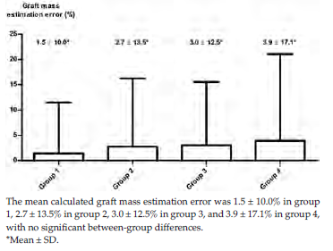 The calculated mean (SD) errors in estimation of graft mass did not differ significantly across the 4 groups: 1.5% (10.0%) for group 1, 2.7% (13.5%) for group 2, 3.0% (12.5%) for group 3, and 3.9% (17.1%) for group 4 (Figure 3; P = .77).