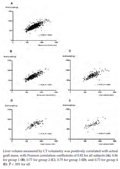 Table 2. Intraclass Correlation Coefficients and Pearson Correlation Coefficients Between Graft Mass and Liver Volume Measured by Computed Tomography-Volumetry in All Subjects and Across the 4 Groups