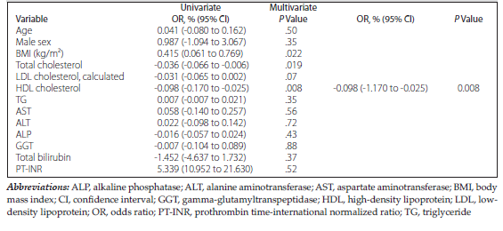 At the time of preoperative evaluation, we collected demographic and clinical variables including age, sex, body mass index, comorbidities such as hypertension and type 2 diabetes mellitus, liver enzymes including aspartate aminotransferase, alanine aminotransferase, alkaline phosphatase, and gamma-glutamyltranspeptidase, total bilirubin, prothrombin time-international normalized ratio, and lipid profile (total cholesterol, triglyceride, high-density lipoprotein [HDL] cholesterol, and calculated low-density lipoprotein [LDL] cholesterol).