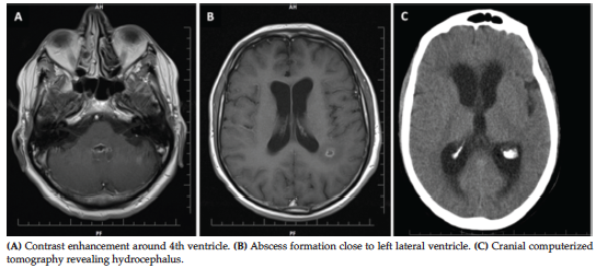 clinic in March 2017 with high fever and severe headache. Cranial MRI showed